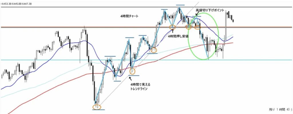 この図で分かるように、4時間足では上昇トレンドでしたが、トレンドライン(オレンジの○4点)を、4時間押し安値を割る前に割ってきました。
