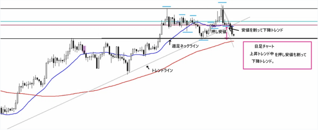 日足では、上昇トレンドでしたが、押し安値を割って下降トレンド。
