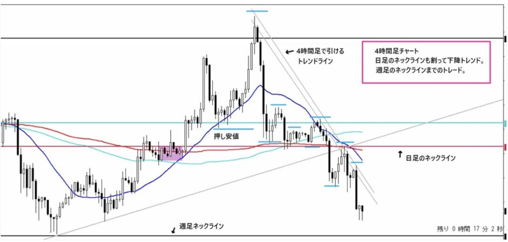 4時間足では安値を割り下降トレンド。日足トレンドラインも抜けて、4時間足のトレンドラインが引けます。