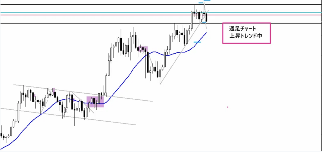 週足では、安値を切り上げて高値更新し続けているので上昇トレンド。週足MAの乖離があるので、それを埋める波に乗っかろうと思います。