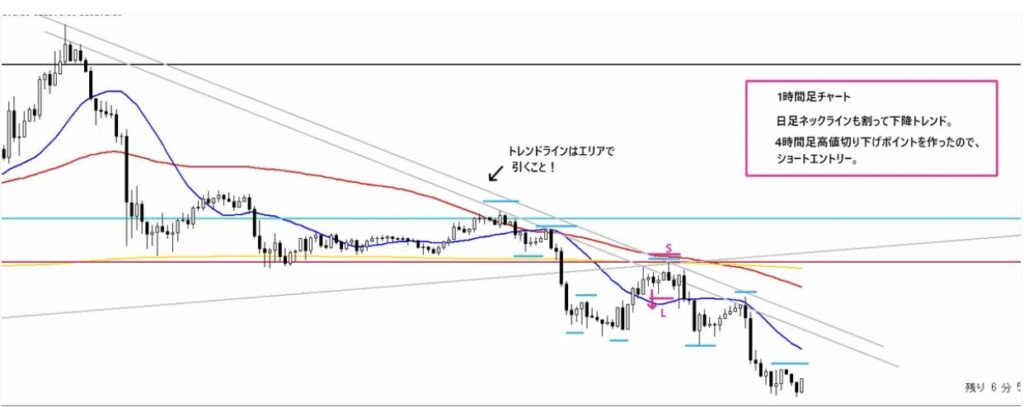 今回はキレイなダブルトップにはなりませんでしたが、1時間の安値割れでエントリー。