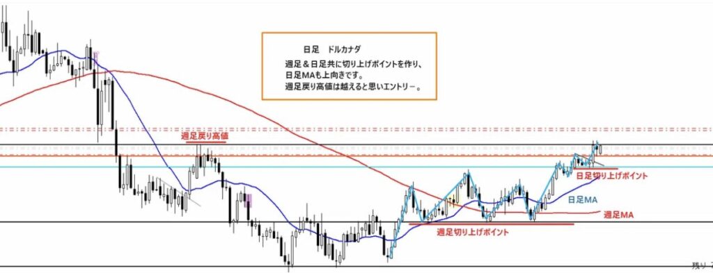 4時間足では7波ですが、1度日足MAに対して4時間MAが収束~拡散してきており、4時間MAを上向き。