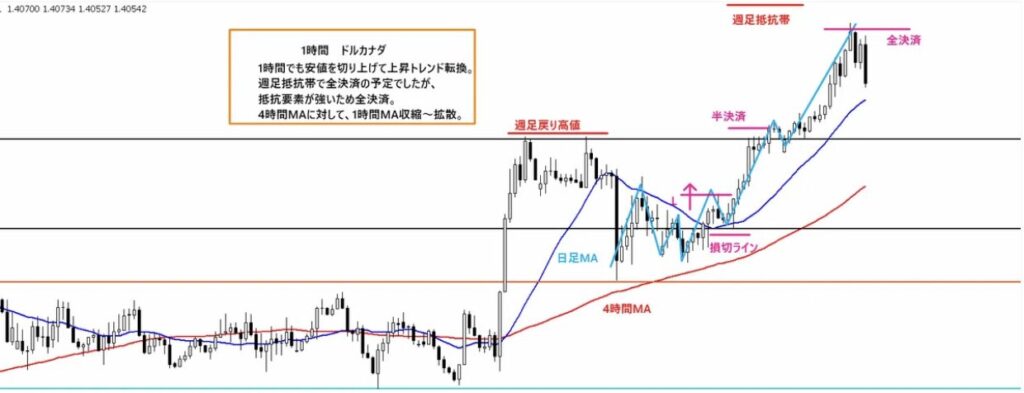 抵抗帯が週足などで見えるくらいの抵抗帯の近くにくると、急落してきて、全戻しになることが多いので、1時間ダウを待たずに決済。
