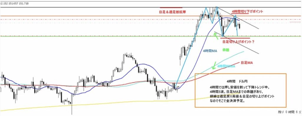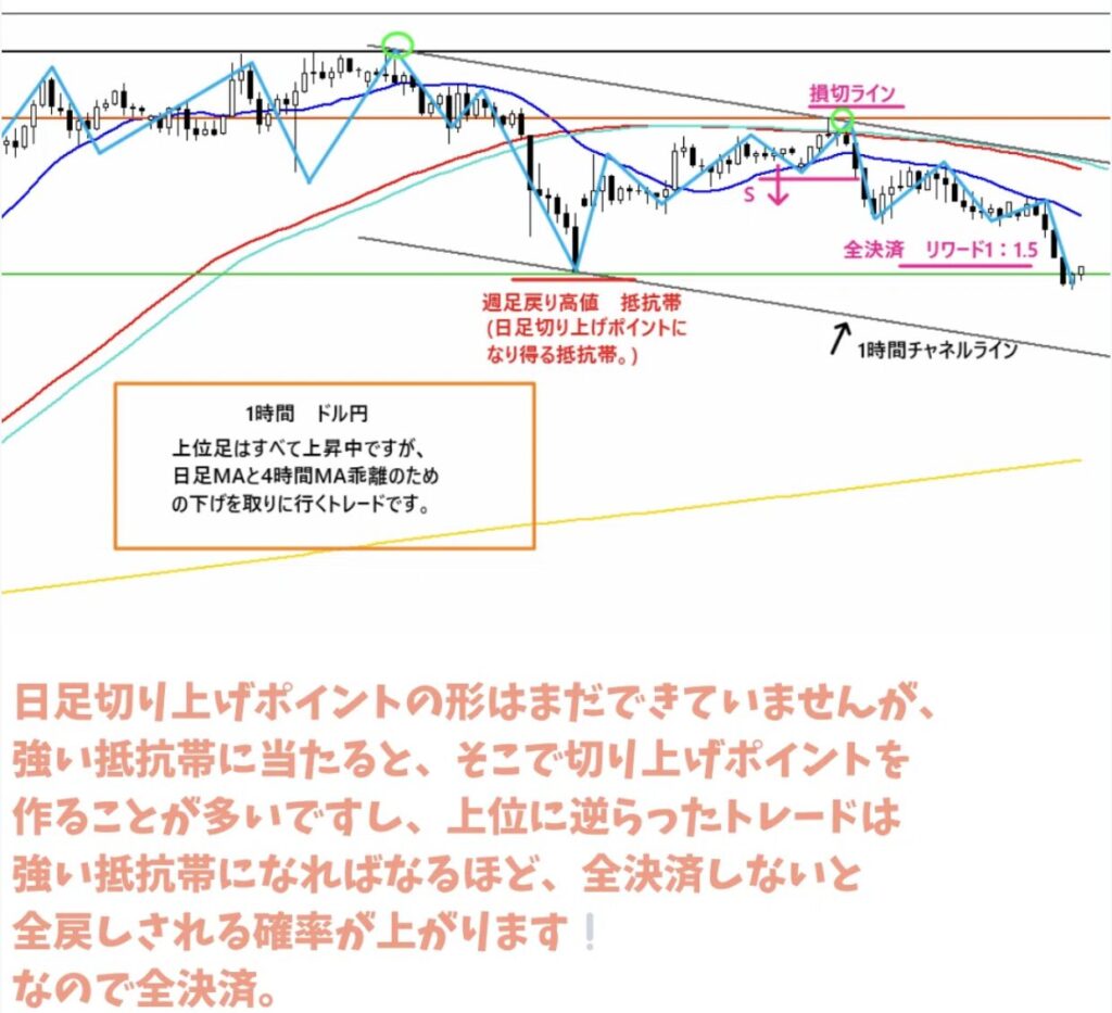 4時間下降3波。4時間では押し安値を割って、下降トレンド。高値も切り下げてきていて、4時間MAも水平から下向きになってきていますのです、日足の押し目買いが入るポイントまでの下げを取りにいったトレードです。