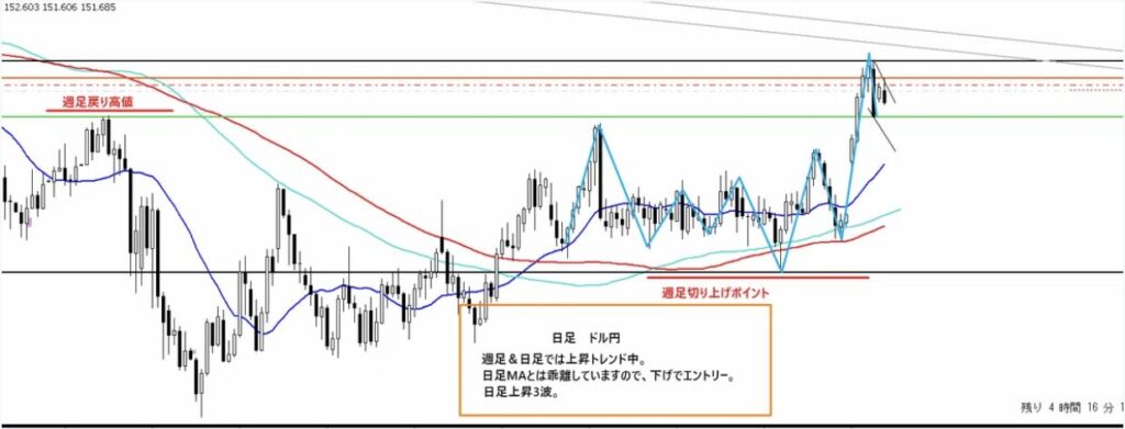 日足押し目形成の下げを取りにいったトレードです。日足上昇3波ですが、一気に上げたため、日足MAとの乖離をみせていますので、ここは、下げでエントリー。