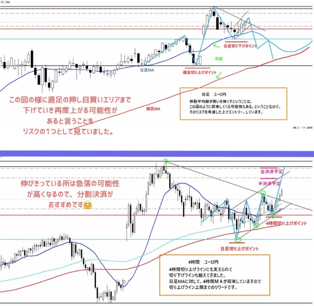 高値掴みのリスクはありましたが、週足&日足共に切り上げポイントを作っていて、上への優位性が高い局面です☺️