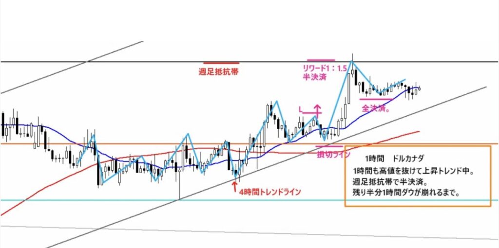 週足抵抗まで、リワードも、1;1.5ありますので、そこで、半決済。