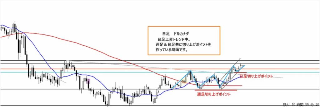 前回は損切りになったドルカナダですが、週足&日足で切り上げポイントを作り上への優位性が高い場所です。