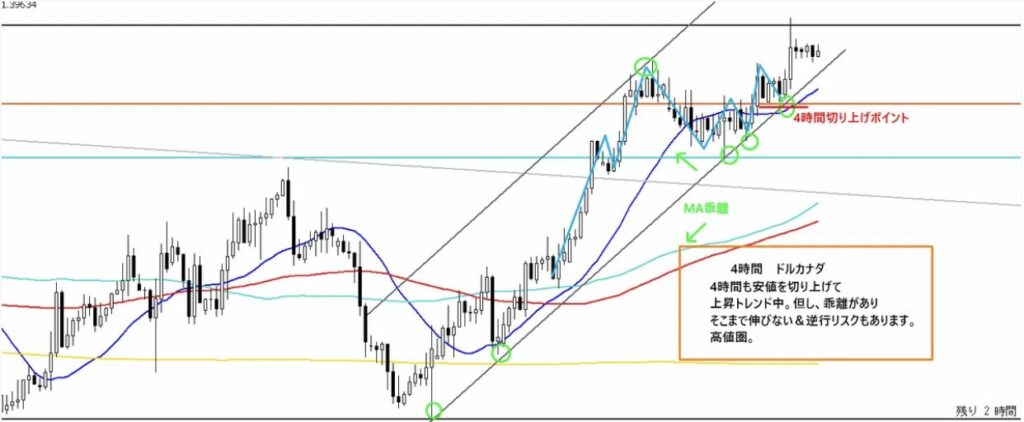 なので、今回エントリーしたポイントは、4時間3波で、上の優位性が高まる所ですが、日足MAと4時間MAは乖離したまま。ということになります。