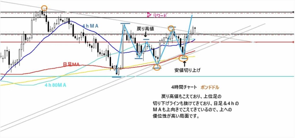 4時間では、持ち合いを越えてきており、80MAも越えてきて、短期MA(青)も上向きなので、1時間でエントリーできそうならしていきたい局面です。
