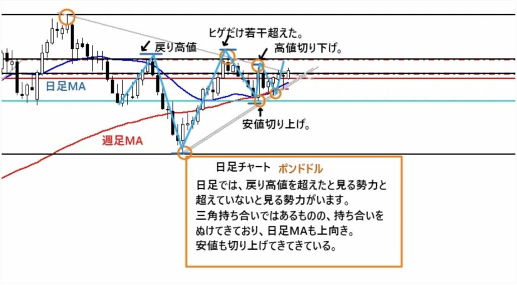戻り高値をヒゲだけ抜けてきていて、安値も切り上げているし、日足MAも上向きなので、完全に上昇中とは、言い難いですが、一応上昇と見ます。