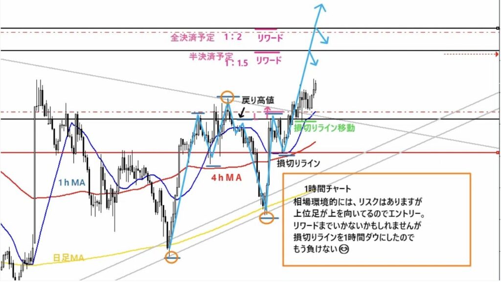 ●ピンクの線&矢印はエントリー&損切り&リワード。