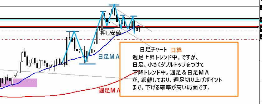 日足MAは、まだ上向きですが、週足MAと日足MAが乖離しているため、そこを埋めてくるのに、下げてくる局面です。