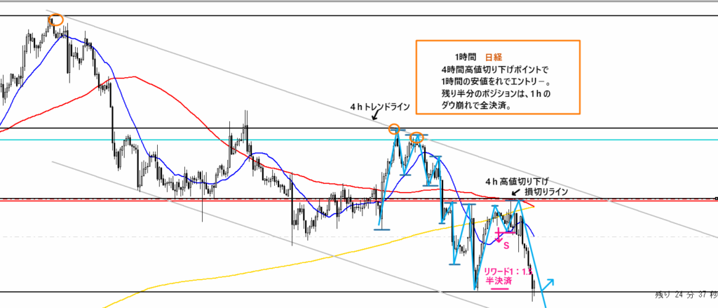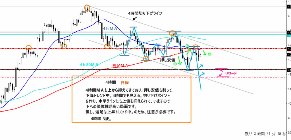 時間でも下降トレンド。水平線&MAにも、上値を抑えられて、4時間でも、切り下げポイントを作ってきていますので、下への優位性が高いポイントです。