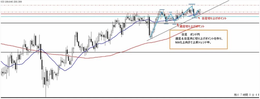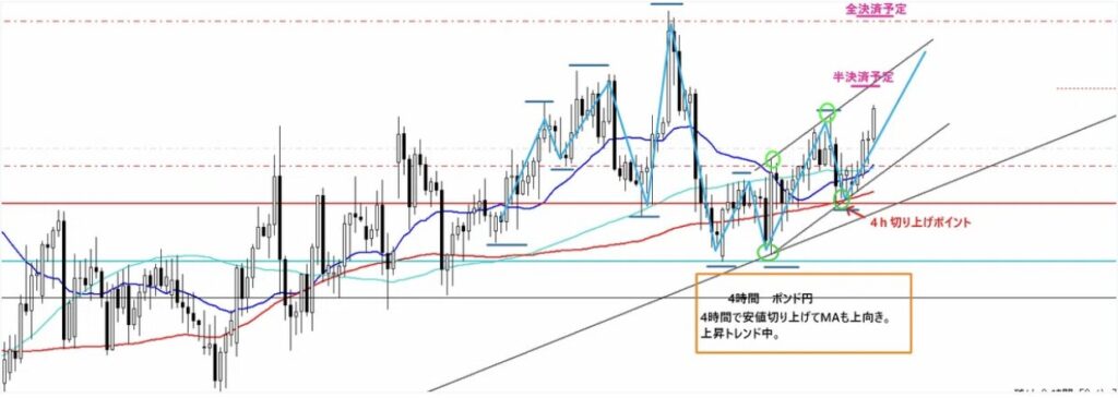 4時間では、抑えてきていた、4時間MAも抜けて、日足MAに対して4時間が収束~拡散場面。4時間切り上げポイントも作ってきていて、上への優位性が高い局面です。
