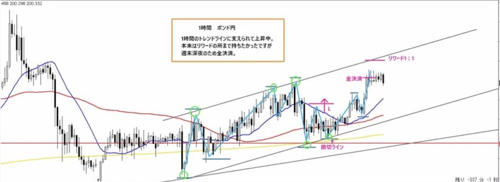 チャネルラインまでで半決済しよう。と思っていましたが、金曜日の週末のため全決済。